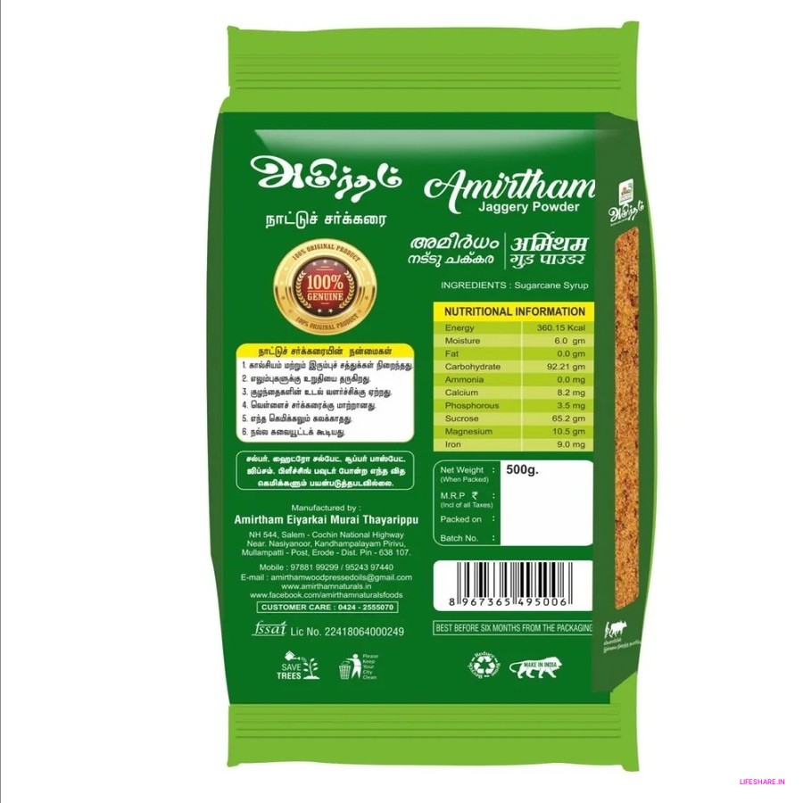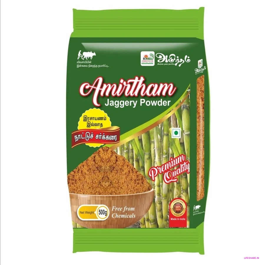 Amirtham Jaggery Powder- 500g - Natural, unrefined jaggery powder, perfect for sweetening dishes with a rich, authentic taste and nutritional benefits.
