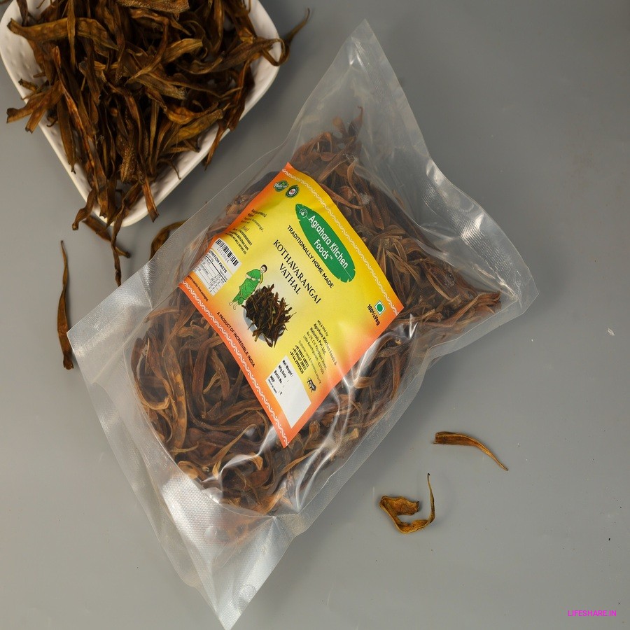 Introducing our Kothavarangai Vathal, a traditional South Indian delicacy made from sun-dried cluster beans. These dried pickles/vathal are bursting with intense flavors and are a perfect accompaniment to your meals. Simply fry them in oil and enjoy as a crunchy and savory side dish or snack. Our Kothavar