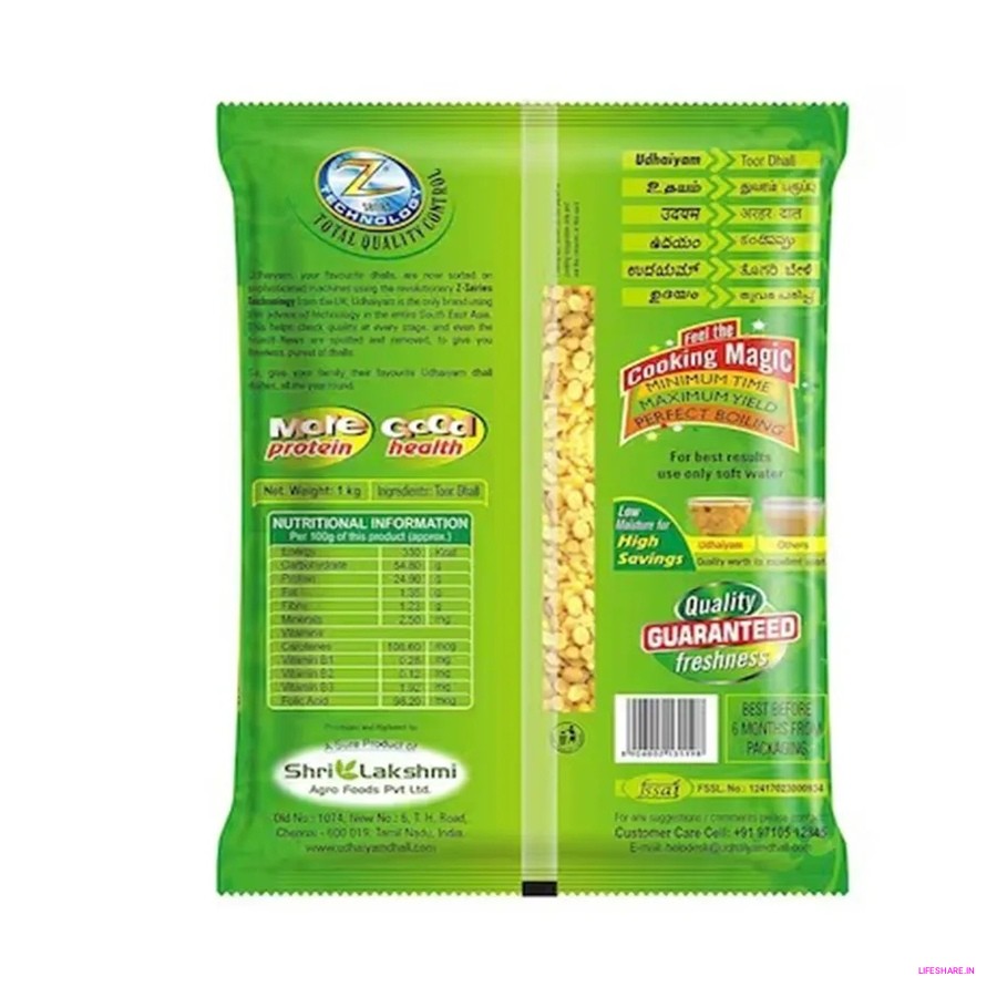 Udhaiyam Toor Dhall is a well-known brand of split pigeon peas, commonly referred to as toor dal. It's a fundamental ingredient in Indian cooking and plays a vital role in creating a wide range of flavorful and nutritious dishes.